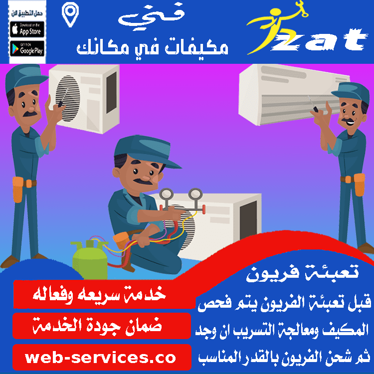 قبل تعبئة فريون مكيفات يتم اختبار معالجة التهريب وبعدها يتم شحن تعبئة فريون المكيف بالمقاسات المناسبة لحجم وقدرة التكييف لا يزيد ولا يقل الخدمة مقدمة 24 ساعة الخرج .